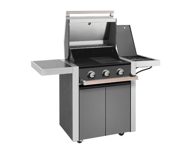 Exclusive to Barbeques Galore, BeefEater 1500 series comes in 3,4 & 5 burner with side burner cart models. This series boasts of stylish woodgrain look control cover/handy bench, large side table. It has easy to assemble cart with storage option. Spacious shelving provides more convenience to place things. Ignition on every knob for ease of start, 15 MJ wok burner is concealed increasing the shelf space when not in use. Powerful 15MJ cast iron burners and flame tamer provide even heat distribution to create superior results. Control panel hideaway when not in use gives a seamless look to your outdoor living space.