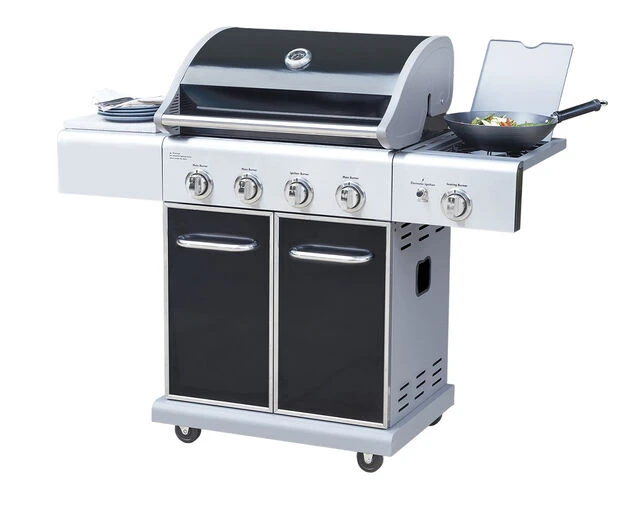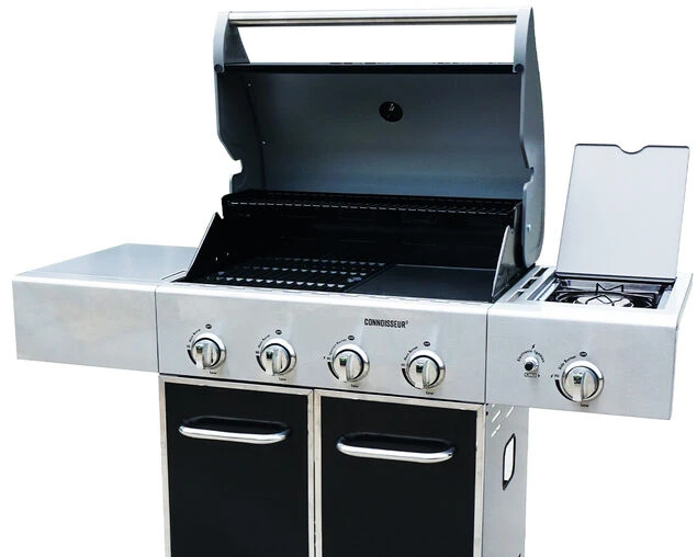 The Connoisseur Deluxe 4 Bnr BBQ with side burner looks stylish and performs admirably. It features a black gloss vitreous enamelled steel hood with an aluminised steel inner for better heat retention when roasting. It also has a gloss vitreous enamelled steel firebox, flame tamers & wire warming rack.